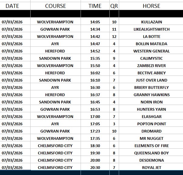 Selections on Tuesdays, Wednesdays, Thursdays, Fridays, Saturdays (Statistically more profit not betting sunday and monday)